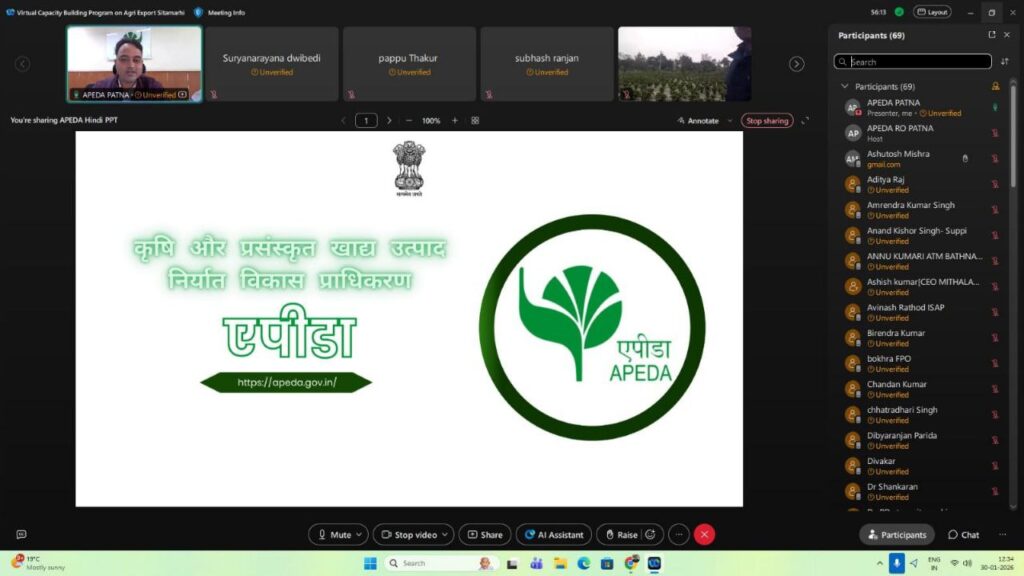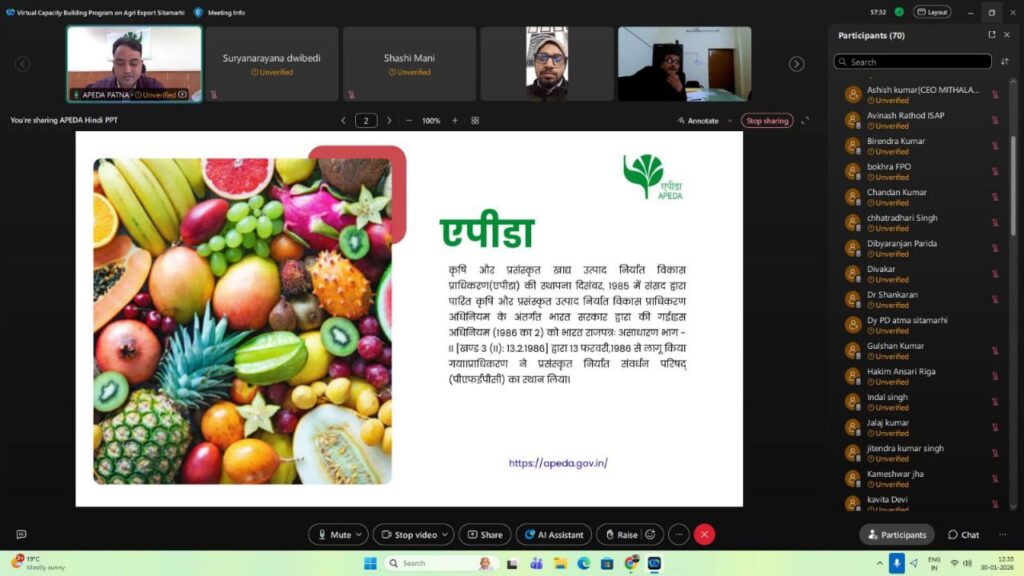 कृषि एवं प्रसंस्कृत खाद्य उत्पाद निर्यात विकास प्राधिकरण (एपीडा), क्षेत्रीय कार्यालय, पटना द्वारा जिला कृषि विभाग, सीतामढ़ी (बिहार) के सह tvयोग से 30 जनवरी 2026 को कृषि निर्यात पर क्षमता निर्माण कार्यक्रम का आयोजन किया गया।