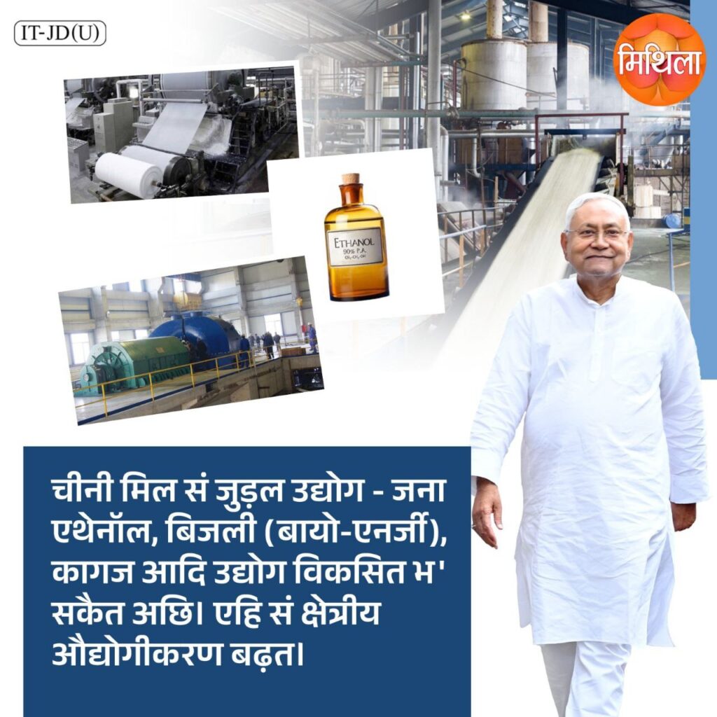 चीनी मिल सं जुड़ल उद्योग – जना एथेनॉल, बिजली (बायो-एनर्जी), कागज आदि उद्योग विकसित भ’ सकैत अछि। एहि सं क्षेत्रीय औद्योगीकरण बढ़त।मिल चालू भेला सं होटल, दोकान, ट्रांसपोर्ट, मशीनरी, किराना, किरायाक मकान आदि व्यवसाय तेजी सं बढ़त।रोजगार उपलब्ध भेला सं युवा लोकनि कें दिल्ली, पंजाब, गुजरात जयबाक जरूरत कम पड़त। एहि सं परिवारिक आ सामाजिक स्थिरता बढ़त।नीतीश सरकार महिला हेल्पलाइन, महिला थाना आ बालिका शिक्षा योजनाक माध्यम सं सामाजिक सुरक्षा वातावरण सुदृढ़ कयल गेल।नीतीश सरकार थाना स्तर पर संसाधन, वाहन, संचार साधन आ तकनीकी उपकरण उपलब्ध करौलक। विशेष टास्क फोर्स (STF) सक्रिय कयल गेल।नीतीश राज मे माफिया, बाहुबली आ कुख्यात अपराधी सभ पर विशेष कार्रवाई कयल गेल। कतेको प्रभावशाली व्यक्तिक गिरफ्तारी आ सजा उदाहरण बनल।