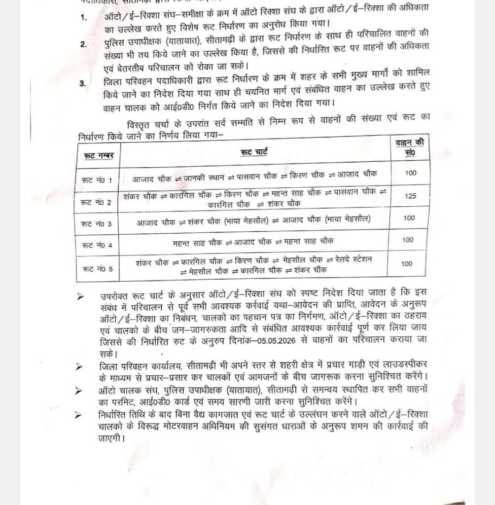 जिला परिवहन पदाधिकारी सीतामढ़ी एवं पुलिस उपाधीक्षक, यातायात ,सीतामढ़ी के द्वारा ऑटो /ई रिक्शा संघ के प्रतिनिधि के साथ बैठक की गई।बैठक में सर्व समिति से वाहनों की संख्या एवं रूट निर्धारण किए जाने का निर्णय लिया गया। इस संबंध में विस्तृत दिशा निर्देश निम्नांकित है:–