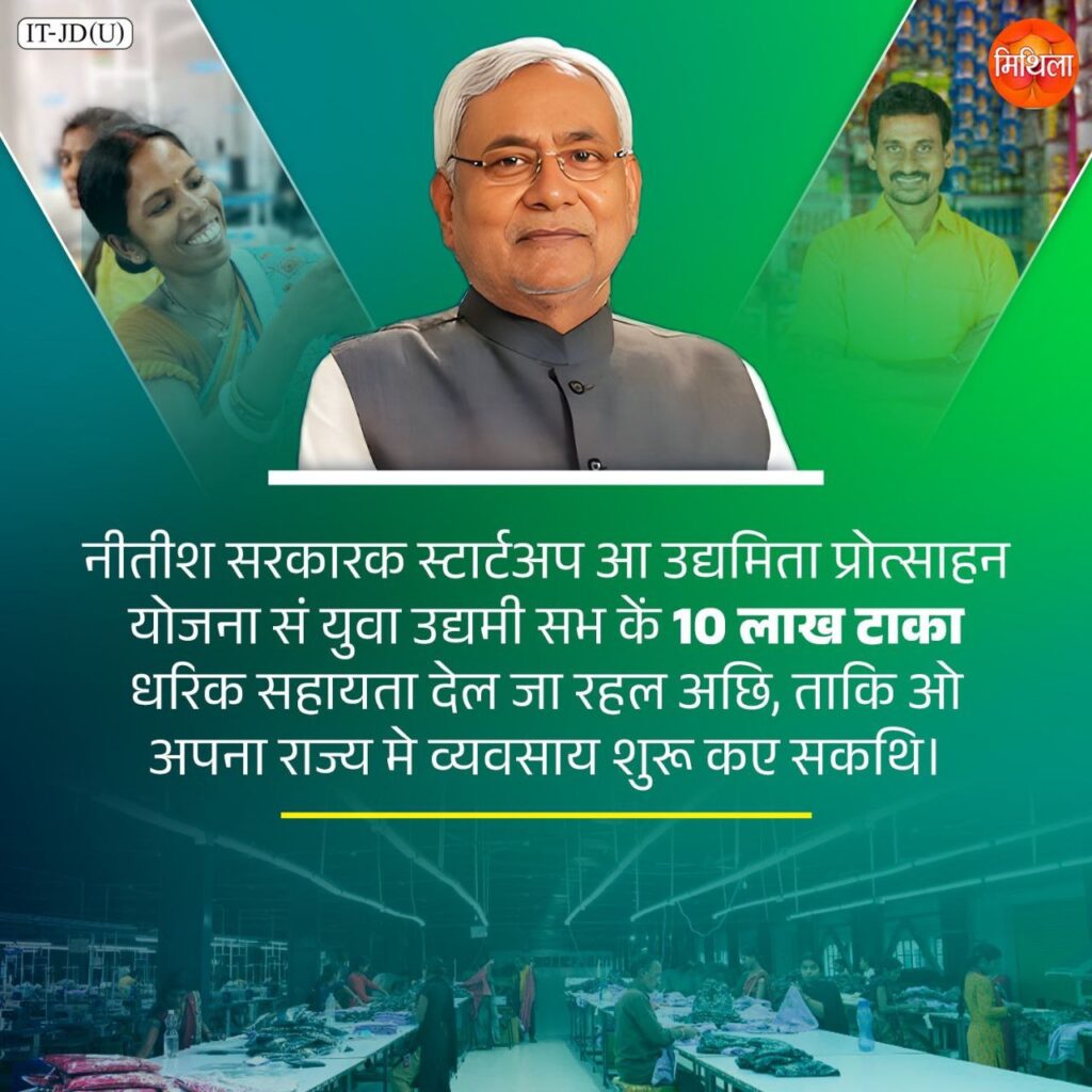 नीतीश सरकारक स्टार्टअप आ उद्यमिता प्रोत्साहन योजना सं युवा उद्यमी सभ कें 10 लाख टाका धरिक सहायता देल जा रहल अछि, ताकि ओ अपना राज्य मे व्यवसाय शुरू कए सकथि।