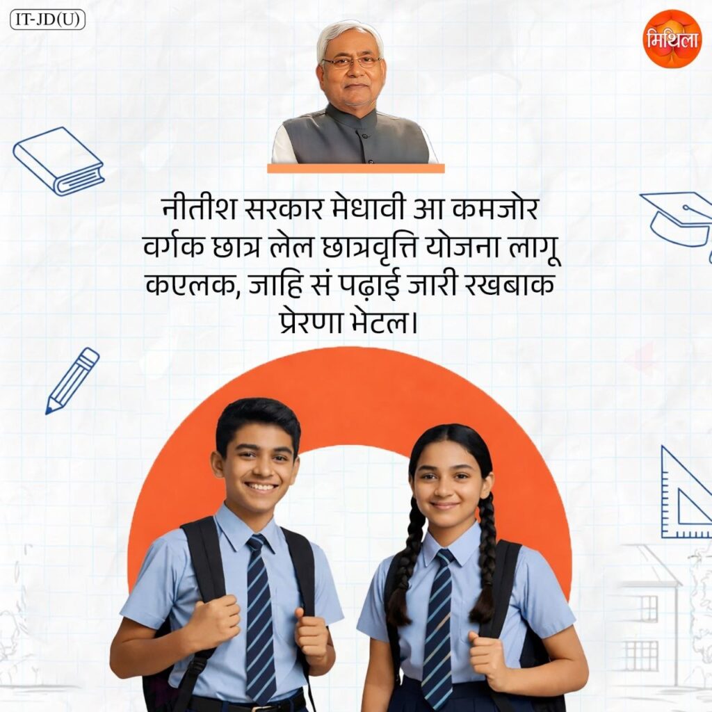 नीतीश सरकार मेधावी आ कमजोर वर्गक छात्र लेल छात्रवृत्ति योजना लागू कएलक, जाहि सं पढ़ाई जारी रखबाक प्रेरणा भेटल।
