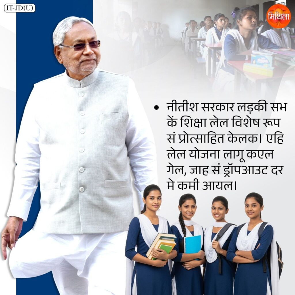 नीतीश सरकार लड़की सभ कें शिक्षा लेल विशेष रूप सं प्रोत्साहित केलक। एहि लेल योजना लागू कएल गेल, जाह सं ड्रॉपआउट दर मे कमी आयल।