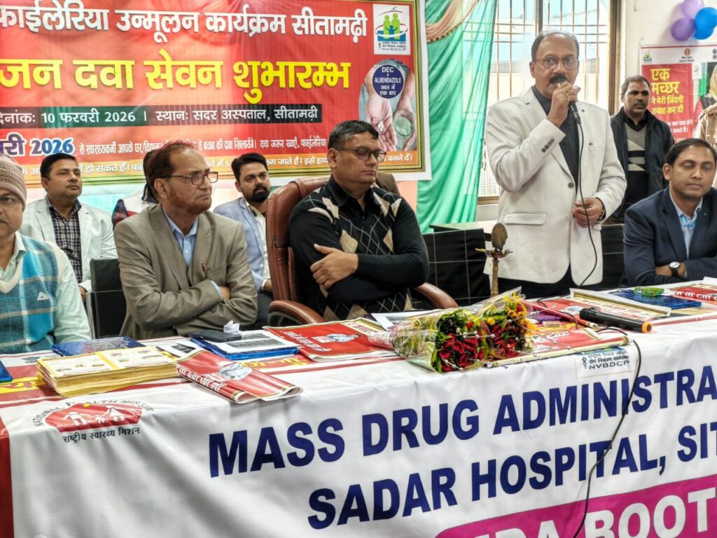फाइलेरिया नियंत्रनार्थ जिले में आज दिनांक 10 फरवरी 2026 से “सर्वजन दवा सेवन कार्यक्रम” की औपचारिक शुरुआत की गई। कार्यक्रम का उद्घाटन सदर अस्पताल, सीतामढ़ी परिसर में प्रभारी जिलाधिकारी सह अपर जिलाधिकारी श्री संजीव कुमार द्वारा स्वयं दवा का सेवन कर किया गया। इस अवसर पर उपस्थित पदाधिकारियों, स्वास्थ्यकर्मियों एवं आम नागरिकों को फाइलेरिया से बचाव हेतु दवा सेवन के प्रति जागरूक किया गया।