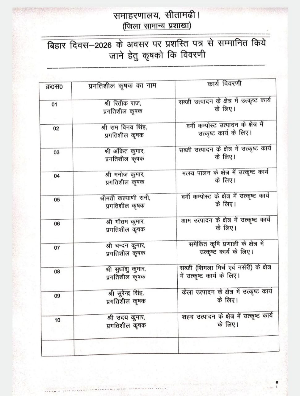 बिहार लोक शिकायत निवारण अधिकार अधिनियम के तहत दायित्व का निर्वहन पूर्ण निष्ठा एवं लगन के साथ किया तथा माह फरवरी—2026 का वस्तुनिष्ठ मानकों का कार्य निष्पादन के आधार पर जारी रैंकिंग में 13वां स्थान प्राप्त किया।