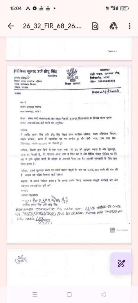 मुख्यमंत्री नीतीश कुमार के साथ अपना फोटो खिंचवा कर अधिकारियों व्यापारियों को धौंस दिखा वसूली का खेल खेलने राजधानी पटना में करोड़ों की जमीन हड़पने वाले फोटू सिंह ने एक माह पहले जक्कनपुर थाना में मुझपर 5 लाख रूपये रंगदारी मांगने का आरोप लगा बेबुनियाद केस दर्ज कर दिया इसके पहले मोबाइल पर हाथ पैर तोड़ने उठवा लेने जान मारने की धमकी दी और मुझे गिरफ्तार करवाने के लिए मेरे पीछे पुलिस को दौड़ा रहा पर हम भी जब घर से निकलते है न तो सर पर कफन बांधकर ही निकलते हैं फोटू सिंह सत्ता संरक्षित सड़कछाप मवाली गुंडों से हम बिल्कुल नहीं डरते सत्ता की जितनी ताकत लगाना है लगा लो धमकी केस मुकदमा जो करना है कर लो रोंग डॉयल में फंस गए हो तुम मेरा कुछ भी नहीं उखाड़ पाओगे कैसी कैसी घिनौनी कृत्य करके जो अकूत संपत्ति बनाए हो और यूपी से भागकर नीतीश के नाम पर बट्टा लगा रहे हो सुशासन को कलंकित कर रहे हो सबका सिलसिलेवार पर्दाफाश कर तुम्हे नंगा कर दूंगा तुम्हे पत्रकार से पाला पड़ा है न कि पत्रकारिता के नाम पर भड़वागिरी करनेवाले से और हां तुम्हारी औकात हैसियत क्या है रग रग से वाकिफ हूं नंगा कर दूंगा कि मुंह तक नहीं दिखा पाओगे और हां केस में कोई जमानत नहीं लूंगा तुम पुलिस को दौड़ा के गिरफ्तार करवाओ इससे ज्यादा तुम कुछ मेरा उखाड़ भी नहीं सकते