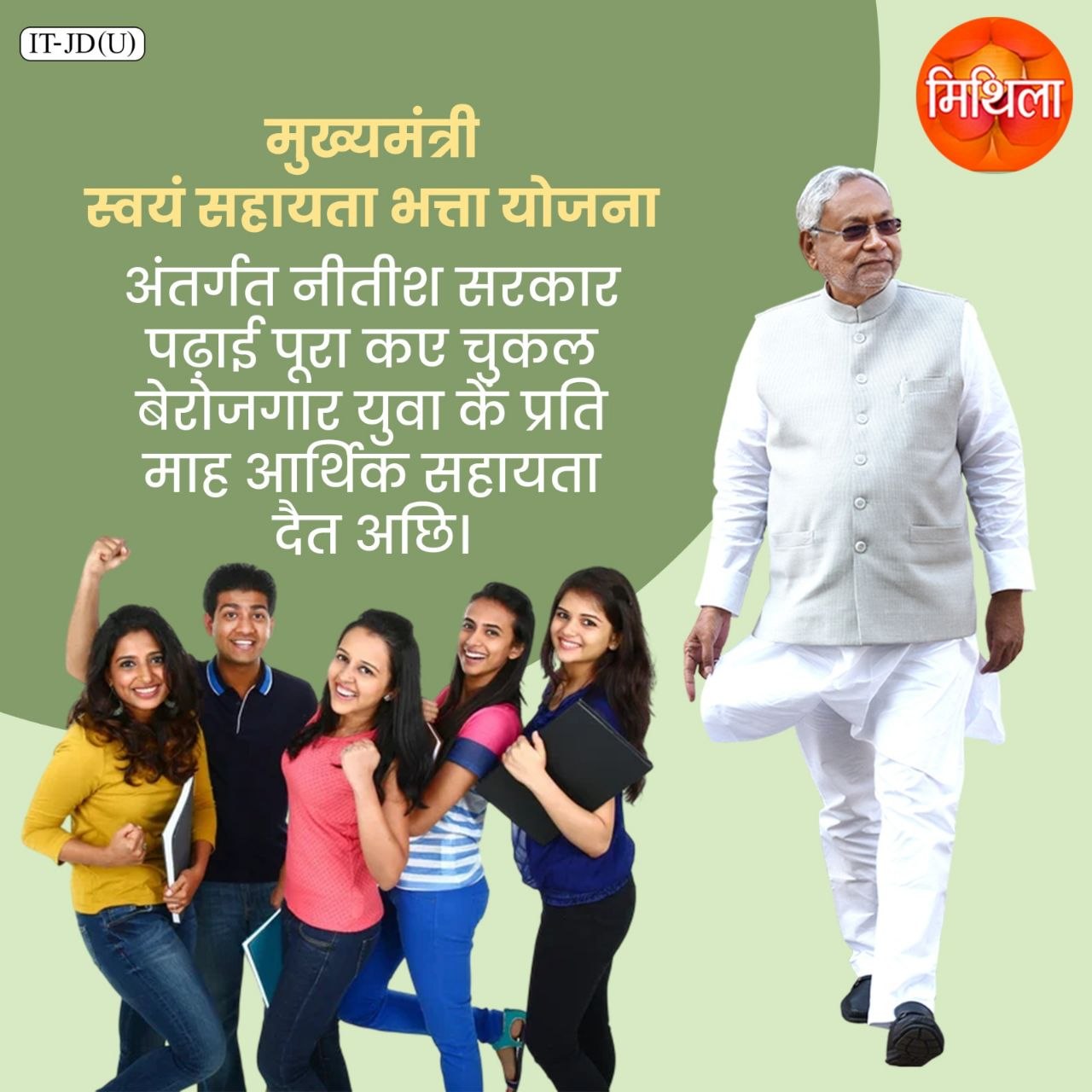 मुख्यमंत्री स्वयं सहायता भत्ता योजना अंतर्गत नीतीश सरकार पढ़ाई पूरा कए चुकल बेरोजगार युवा कें प्रति माह आर्थिक सहायता दैत अछि।