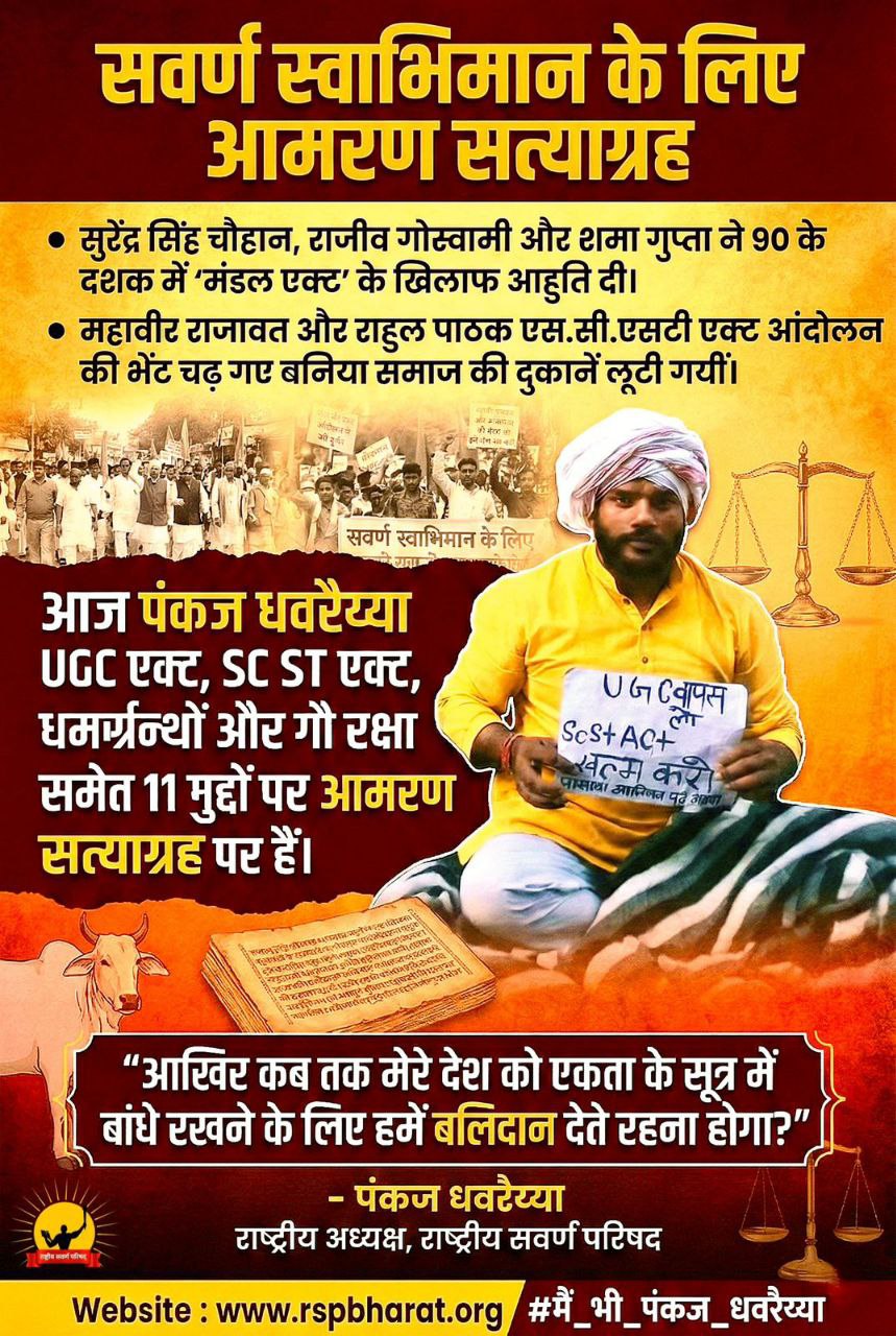 सभी लोग सवर्णों के बच्चों की लड़ाई लड़ने वाले पंकज धवरैय्या भाई कॊ समर्थन दें। अपने दोनों हाथ में एक पोस्टर लिखकर मोदी जीं मैं भी पंकज धवरैय्या हूँ लिखकर फोटो खींचकर सोशल साइट पर साझा करें। पंकज धवरैय्या के इस UGC SCSTACT रोल बेक आंदोलन कॊ सफल बनाए जिससे मोदी सरकार डर जाए। एक