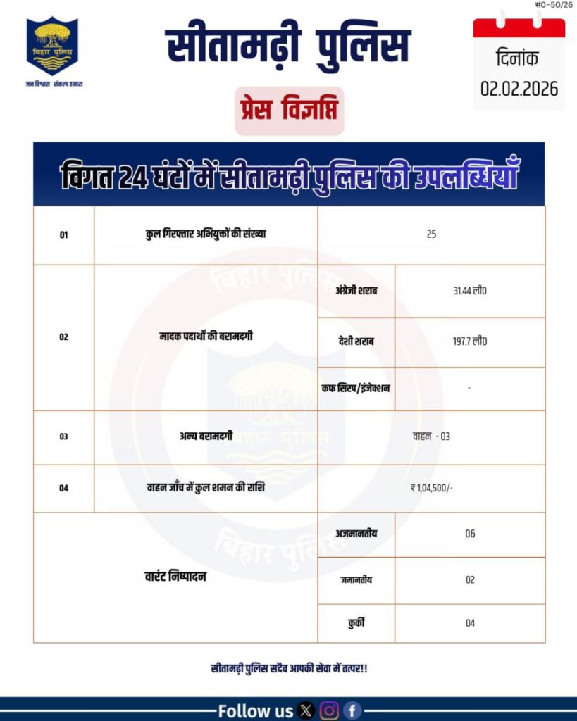 सीतामढ़ी जिला में जनता की समस्याओं के त्वरित निवारण हेतु जन शिकायत सुनवाई का आयोजन प्रत्येक कार्य दिवस को किया जाता है। इसी क्रम में आज दिनांक 02/02/2026 को पुलिस अधीक्षक, सीतामढ़ी के द्वारा लोगों की समस्याओं को सुन आगे की कार्रवाई हेतु अग्रेषित किया गया।