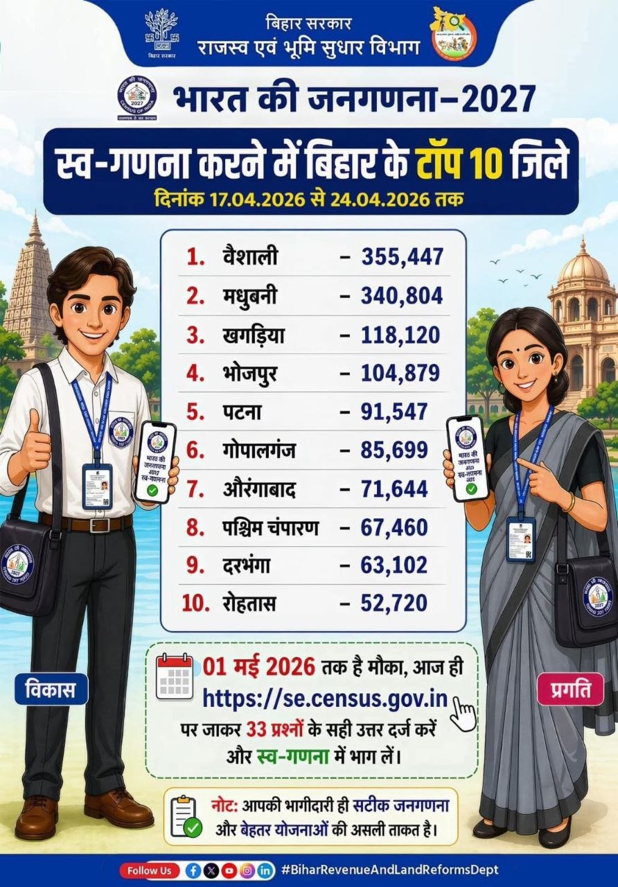 मधुबनी 25अप्रैल 2026 भारत की जनगणना-2027 के अंतर्गत चल रहे स्व-गणना अभियान में मधुबनी जिले ने उत्कृष्ट प्रदर्शन करते हुए पूरे बिहार में द्वितीय स्थान प्राप्त किया है। यह उपलब्धि जिले के नागरिकों, प्रशासनिक पदाधिकारियों एवं जनप्रतिनिधियों के संयुक्त प्रयासों का परिणाम है।